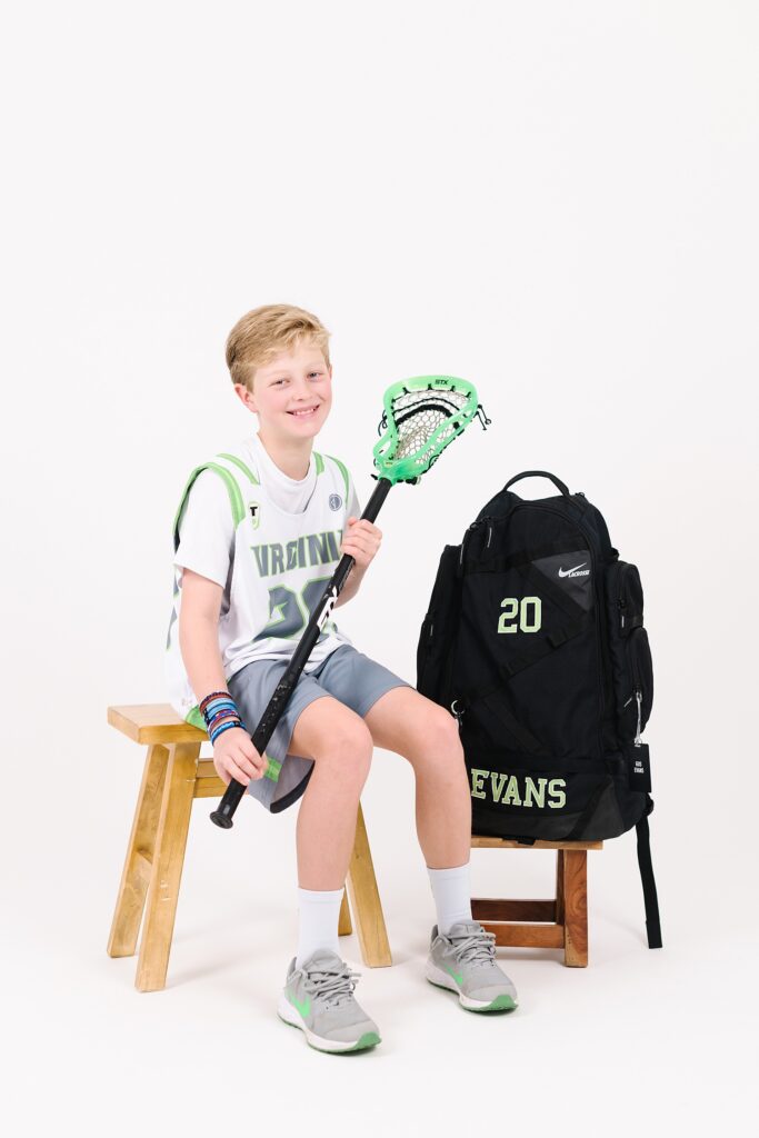 • A proud lacrosse player showing off his gear